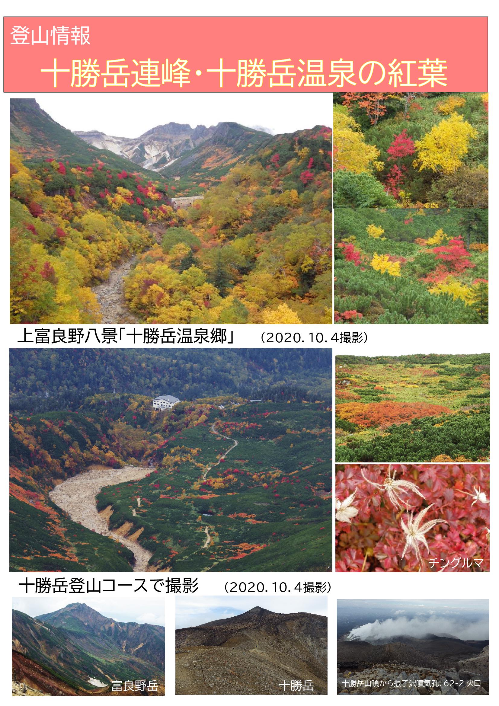 登山情報 十勝岳 2020年10月4日 北海道の山は大変寒いです。大雪山系では早い年では、9月中旬には初冠雪の便りを聞くこともあり、道内の2,000メートルの山々は、本州の3,000メートル級以上の山の気象条件に匹敵すると言われていますので、防寒対策は十分すぎるくらいに用意してください。